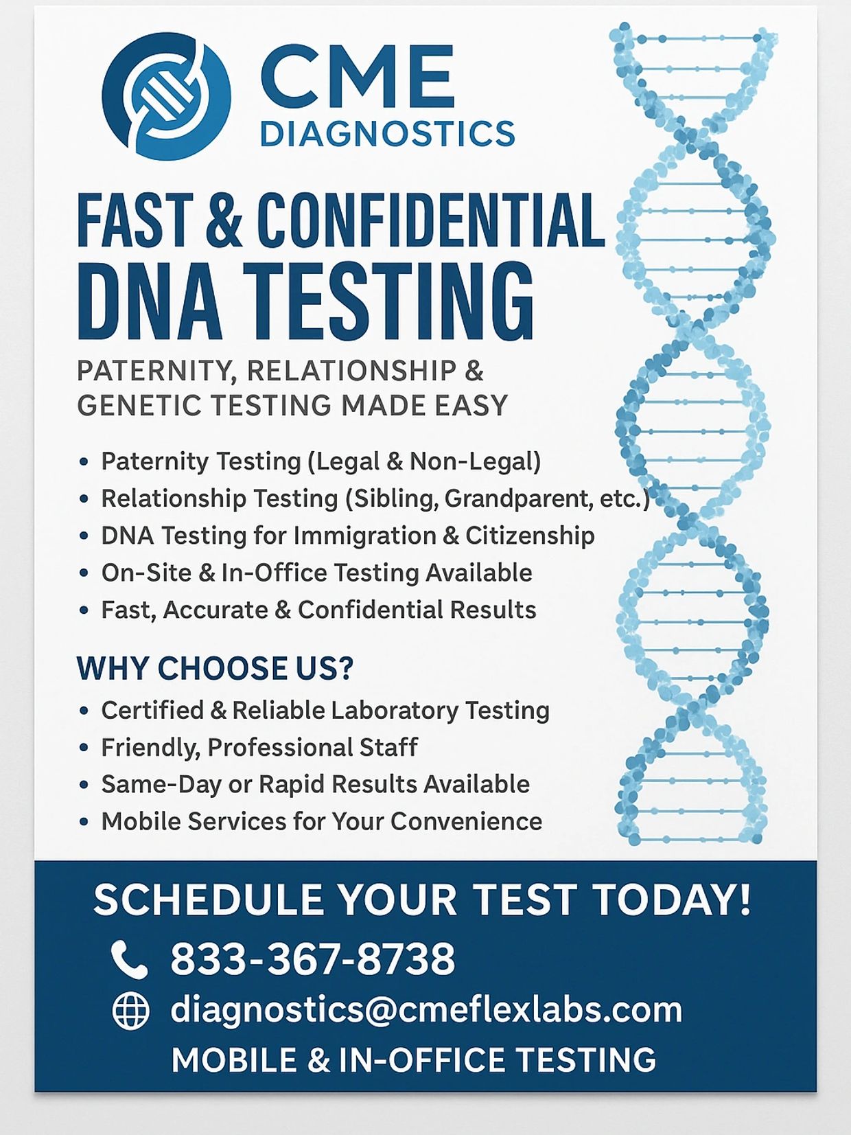 Schedule your appointment today for a convenient mobile lab experience that offers services like dna tests, drug tests, including both dot and non dot options, and paternity tests right at your doorstep.